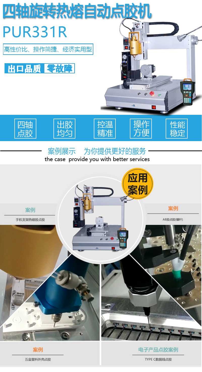产品用途:固科/Glueforce四轴旋转热熔胶自动点胶机TZ-PUR331R适用于不同生产制造领域,广泛应用于精密五金行,塑胶行业,电子行业,家电行业行业等。适应胶水面广泛,如UV胶、环氧树脂,硅胶,AB胶、黑胶、白胶、PU胶、瞬间胶、红胶、锡膏、散热膏、聚胺脂等。